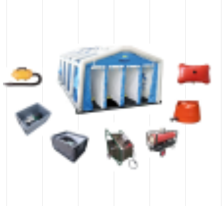 对受到有毒物质污染的人体进行喷淋洗消,也可做临时会议室、指挥部、紧急救护场所等。全套面积大于30㎡。全套包含:洗消帐篷、电动充排气泵和气瓶充气装置(多口同时充气)、洗消供水泵、洗消排污泵、洗消水加热器、洗消液均混罐、暖风发生器、洗消废水回收袋、移动式高压洗消泵(含喷枪)、各部件之间采用模块化装配与设计,可以快速的组建整套系统,组建时间不超过10分钟。